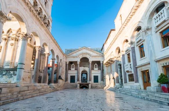 Diocletian’s vast complex today forms most of Split’s old town with the site of the ancient fortress now housing shops, cafes, and restaurants. In fact, remnants of the four gates – Golden, Silver, Iron, and Bronze – guard the main entrances. You will find surprises at every turn: there are tall medieval buildings lining the streets, buttressed by unmistakably Roman columns.