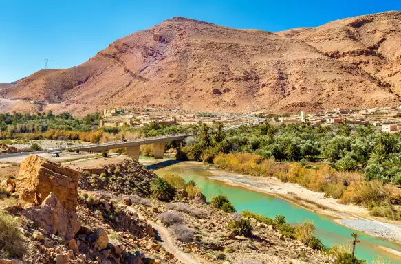 Watch mountainous scenery and azure waters pass you by on a scenic drive through the Atlas Mountains on the way to Erfoud.