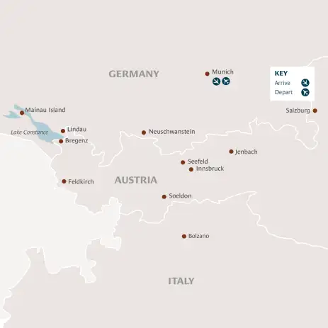 On this trip, you'll be able to immerse yourself in the alpine scenery and cultural heritage of Tyrol. You’ll be inspired by the imperial history of its beautiful capital Innsbruck, the soaring summits of the Oetztal Valley, the towering turrets of the Neuschwanstein castle and the heritage-rich towns of Bolzano. And then, head to Lake Constance, the meeting point of three fascinating countries - Germany, Austria and Switzerland - to explore its beautiful islands and shore-side towns and cities.