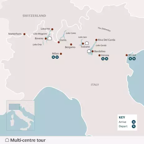 Embark on a grand tour to experience the very best of the Italian Lakes, featuring the shimmering waters of Lake Garda, the peaceful shores of Lake Iseo, the majestic allure of Lake Maggiore, the picturesque beauty of Lake Como, and the tranquil splendour of Lake Orta. Each of these five lakes offers its own unique character, from dramatic mountain backdrops to charming lakeside villages, making them some of Northern Italy's most mesmerising destinations.
