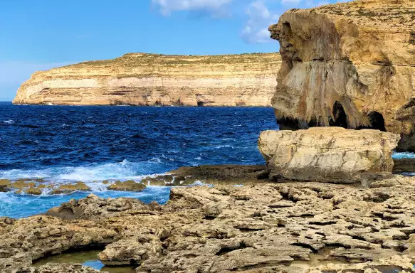 A little along the bay lies the striking coastal rock formations that border Gozo's inland sea. Rugged promontories and sheer cliffsides frame the cerulean depths of the waters that were once home to the magnificent Azure Window - a star of the screen, this colossal limestone arch is now unfortunately lost to the sea.