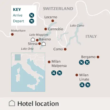 Fly to Italy and transfer to the delightful town of Stresa or Baveno on the peaceful shores of charming Lake Maggiore.