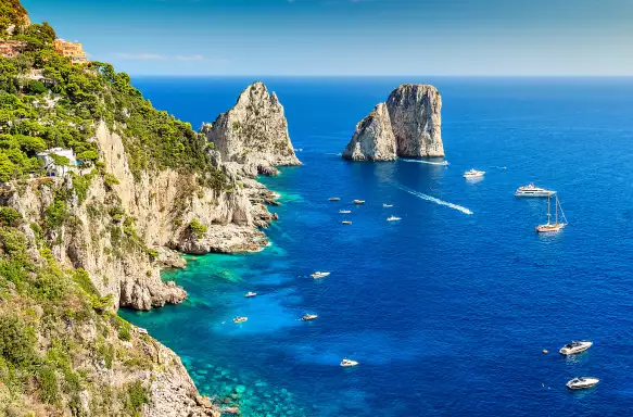 Of course, its popularity is definitely not unfounded and, as we approach by boat, you'll begin to see why. The main town is perched on a hill looking down on the quaint harbour where small fishing boats and luxurious yachts bob in the water and restaurants line the busy quayside. You'll have free time to explore the island as you please before a spectacular cruise in a private boat. Enjoy Capri from a different perspective and take in the most magical of views of this glamorous island.