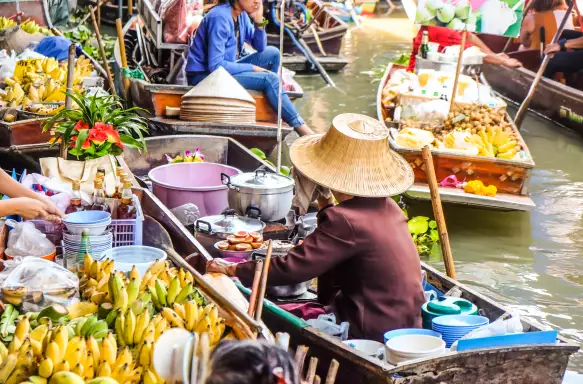 Next, in our small group we travel to one of Thailand’s most iconic attractions—the floating market of Damnoen Saduak. Boarding a traditional longtail boat, we’ll cruise through a network of narrow canals flanked by lush coconut groves and vibrant riverside vegetation. Along the way, you may spot water monitors basking on the banks or glimpse the remaining stilted homes, some still standing, others now only memories marked by weathered wooden posts.