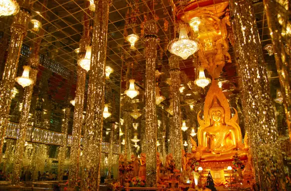 We’ll explore several key buildings, including the Golden Castle, the Vihara of Luang Phor Saksit, and the Standing Buddha Pavilion. But the true highlight is the Crystal Mandapa—a 100-metre-long sanctuary often described as Thailand’s own “hall of mirrors.” Its walls, columns, and ceiling are adorned with mirrored tiles that shimmer with light, creating a surreal and serene atmosphere. At one end lies the preserved body of Luang Por Ruesi Ling Dam, the monk who led the temple’s restoration, while at the other stands a radiant golden Buddha, its reflection dancing across the mirrored surfaces.