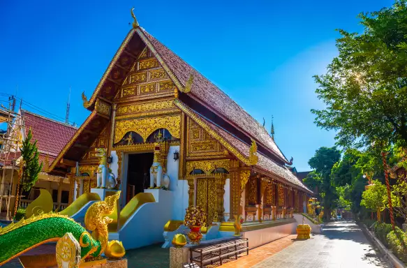 After the market, we venture into the spiritual heart of Chiang Mai, visiting revered temples such as Wat Phra Singh. Nestled within the old town, this temple complex showcases a contrast of eras—ancient wooden structures stand beside newer buildings adorned with whitewashed walls and vibrant, multi-tiered roofs. Within the complex lies one of Chiang Mai’s oldest temples, where guests may receive a traditional blessing from a monk. A small donation of approximately 50 THB is customary, offered in exchange for a sacred bracelet gently tied around the wrist.