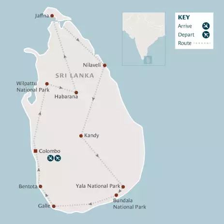 - Travel the full compass of the island with visits to Sri Lanka's northernmost and southernmost points, the vibrant western capital, Colombo, and relaxing stays on the island’s east and south coast.