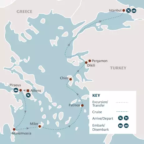 Embrace the history of the greatest ancient civilisations, legendary cities at the crossroads of eastern and western cultures, and picturesque islands in the glistening Aegean where time has almost stood still.