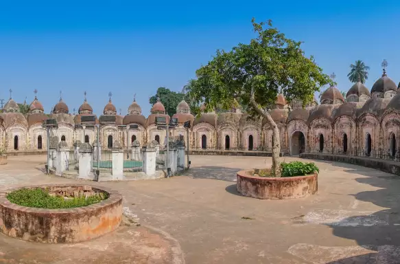 Hop aboard an e-rickshaw for a guided tour through this historic town, where you’ll discover some of Bengal’s finest terracotta temples at the Rajbari temple complex. A standout is the unique Nabakailis temple, built in 1809 and featuring two concentric circles of 108 eight-slope-roofed shrines dedicated to Lord Shiva. Bengal temples often echo the form of traditional village huts, featuring curved, sloping roofs arranged in one, two, three, four, or—like in this case—eight tiers. The number 108 holds deep spiritual significance in Hinduism, often associated with sacred chants and meditation.