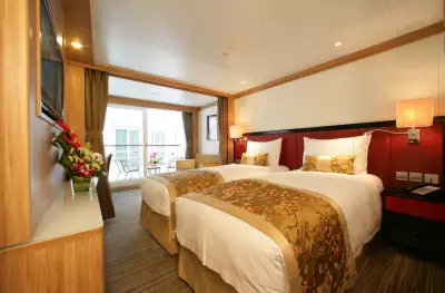 Located on the upper deck, these Deluxe cabins measure 28 square metres, featuring a private balcony.