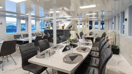 The Upper Deck houses the ship's air-conditioned dining room, where you can indulge in some delicious meals in a comfortable setting. The dining room also includes a bar area, allowing you to enjoy refreshing drinks alongside your lunch or dinner. Complimentary water, tea, and coffee are available throughout the day, with additional beverages available for purchase from the onboard bar. Adjacent to the dining room is an outdoor covered terrace, perfect for relaxing with a drink, socialising, or simply enjoying the stunning sea views.