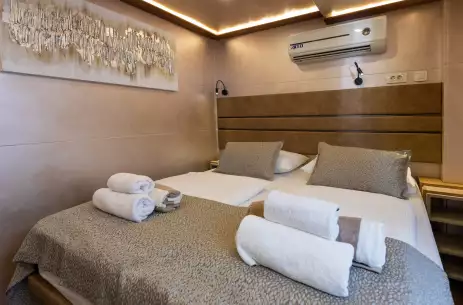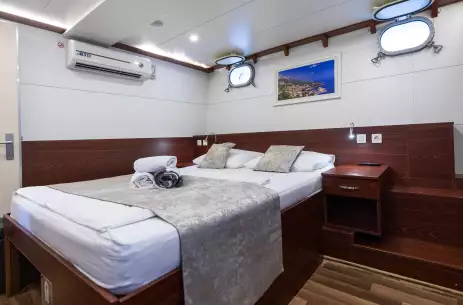 This cosy cabin opens out onto the Main Deck and features a flat-screen TV, individual controlled air conditioning, en suite bathroom with walk-in shower and a porthole window.