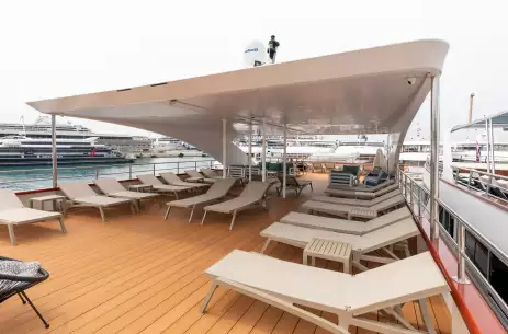 The Sun Deck is the highest level of the ship, designed for ultimate relaxation. It features comfortable sun loungers where you can bask in the sunshine, unwind, and enjoy panoramic views of the ocean. For added luxury, a jacuzzi is available on this deck, providing the perfect spot to soak while taking in the surrounding seascapes.