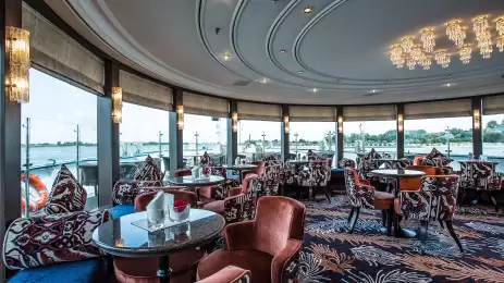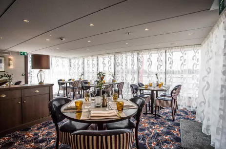 The ship’s main restaurant is located on the Ruby (middle) Deck and here you will experience not only exceptional first class cuisine, but also the most attentive yet discreet service from the ship’s highly professional crew. So just sit back with a well-deserved glass of wine from the carefully selected wine list and delight in the wonderful elegance of your surroundings; beautifully laid tables for just 4 or 6 guests, crisp linen, deep wool carpets and warm wood panelling abound to offer a delectable dining experience of the highest order.
