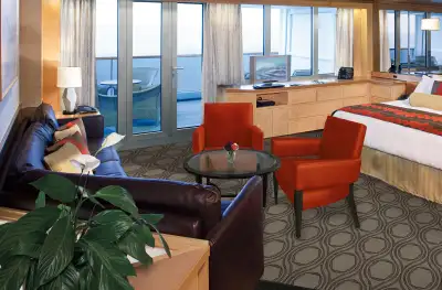 Perched on the Navigation Deck, the Pinnacle Suite is a lavish 1,296 sq. ft. sanctuary with a private verandah, king-size bed, whirlpool bath, and floor-to-ceiling windows framing breathtaking ocean views.