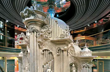 Inspired by the world of music, Zaandam’s décor features unique touches such as signed guitars from legendary artists including Queen, Iggy Pop, Eric Clapton, and the Rolling Stones, as well as a striking Baroque-style pipe organ. This spacious vessel stretches 781 feet in length, offering ample room for you to unwind and enjoy the journey.