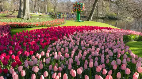 Visit Keukenhof, the world’s largest flower garden, covering nearly 80 acres! Nothing prepares you for the dazzling carpet of colours created by the seven million tulips, hyacinths, daffodils and other blooms arranged in rows, swirls and every other imaginable shape.