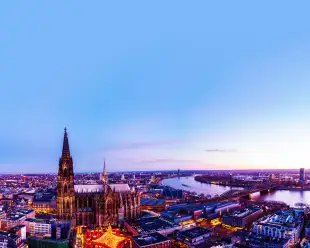Aerial shot of the Cologne Christmas Markets during sunset in Germany